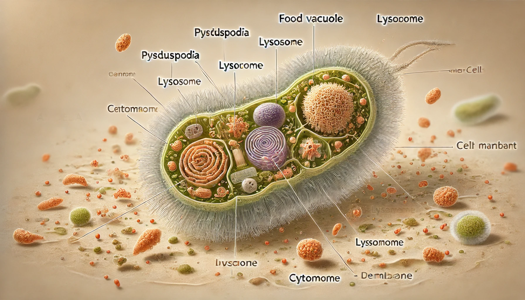 - Вакуоль ішіне лизосомалардан ас қорыту ферменттері келіп, олар көмірсуларды, майларды және белоктарды кіші молекулаларға дейін ыдыратады.